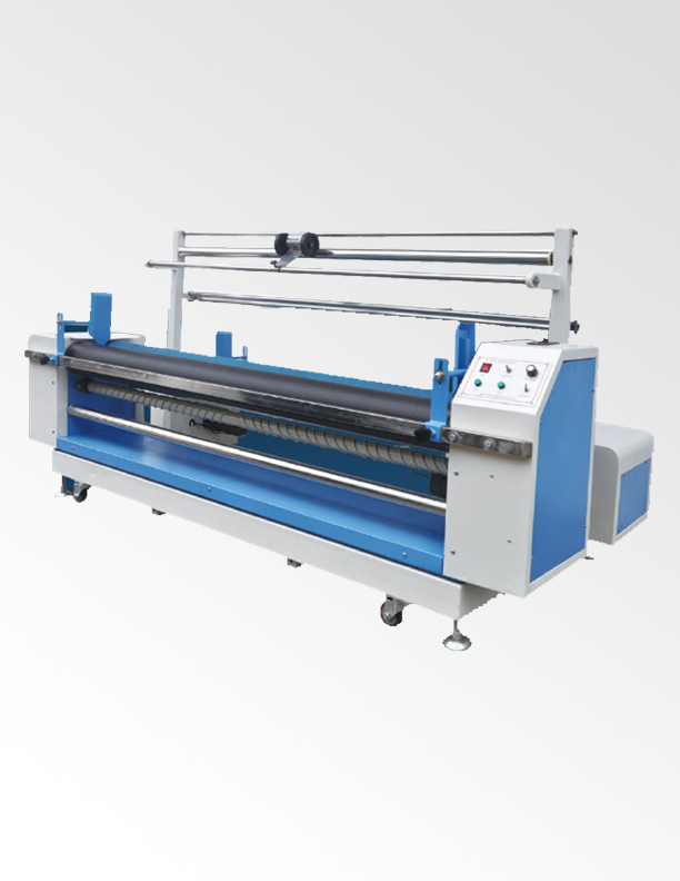 Fabric rolling from relaxed or rolled fabric, with measuring counter and edge alignment with tension adjustment.